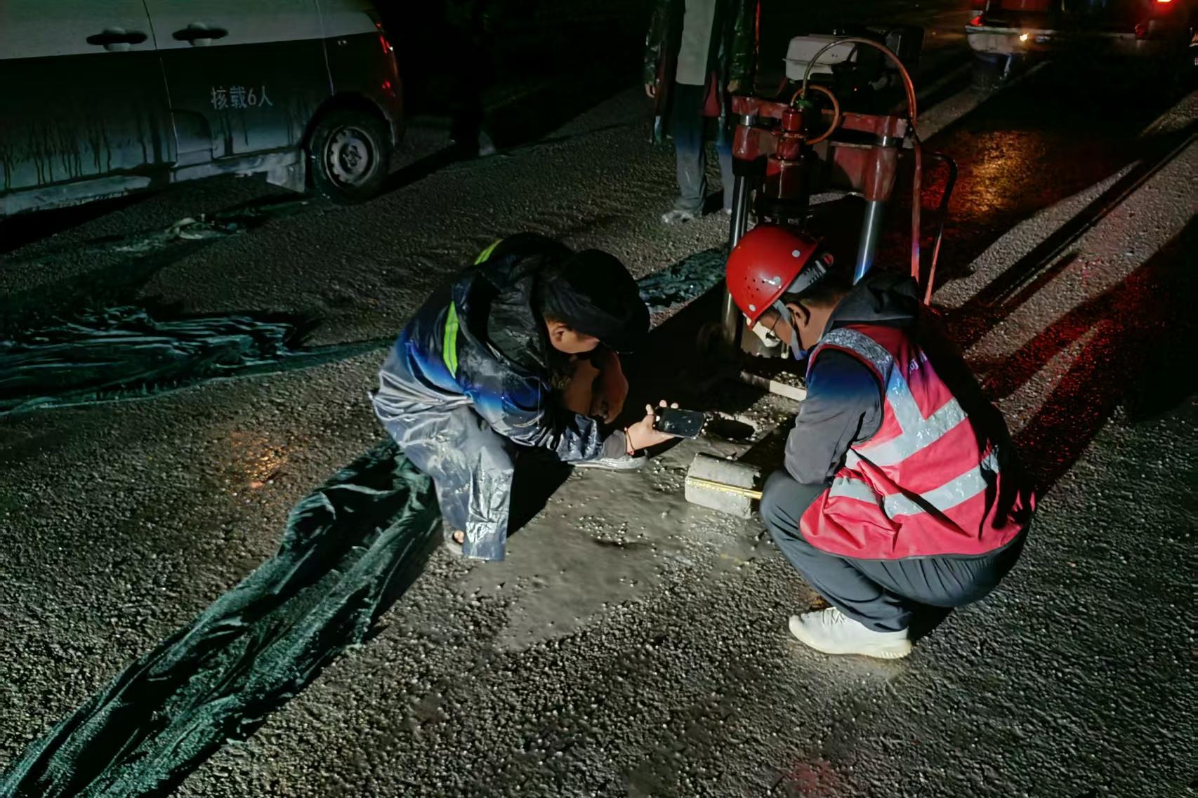 △崔玉坤在项目现场进行道路基层钻芯取样