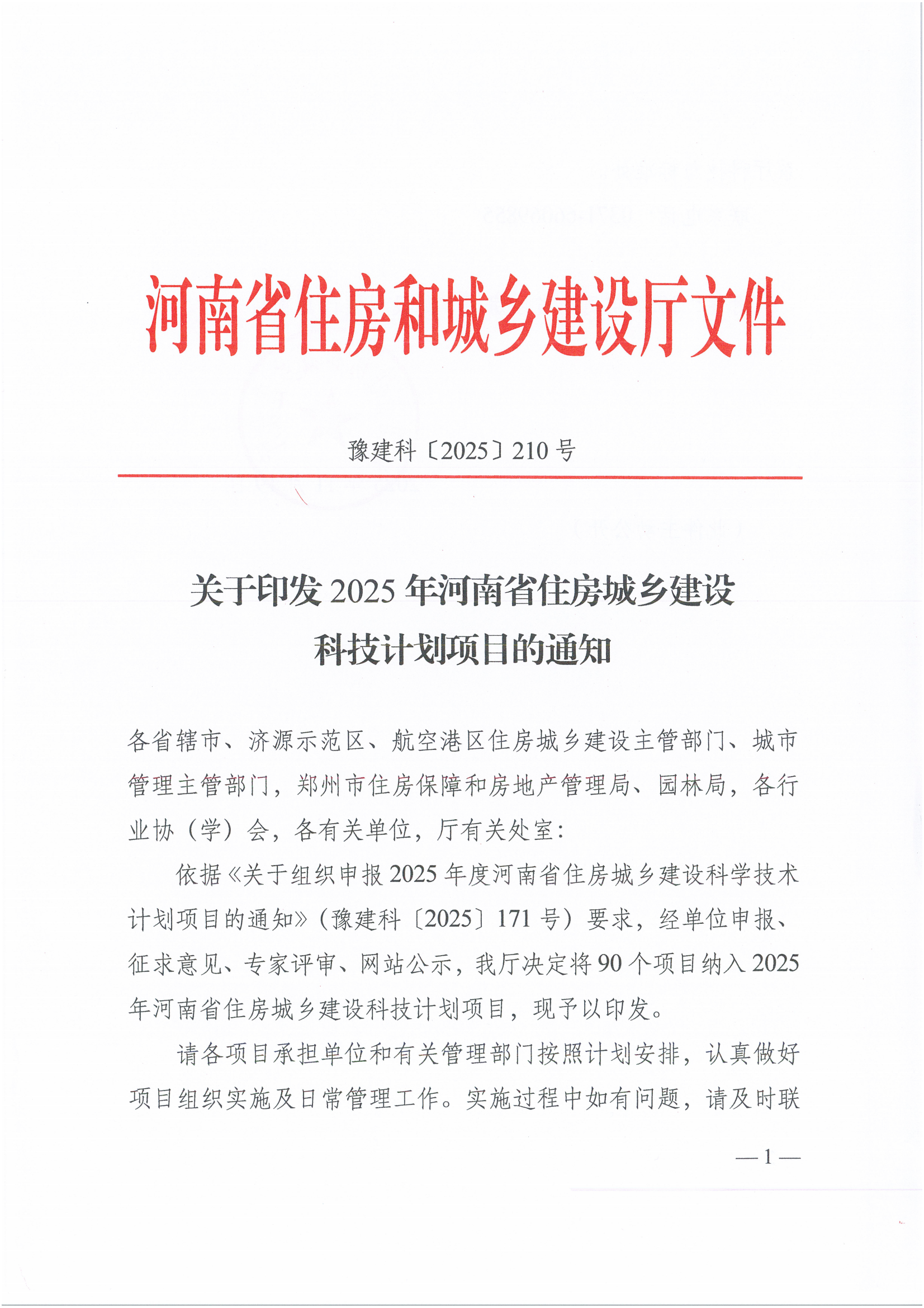 综开集团科技课题成功纳入2025年河南省住房城乡建设科技计划项目