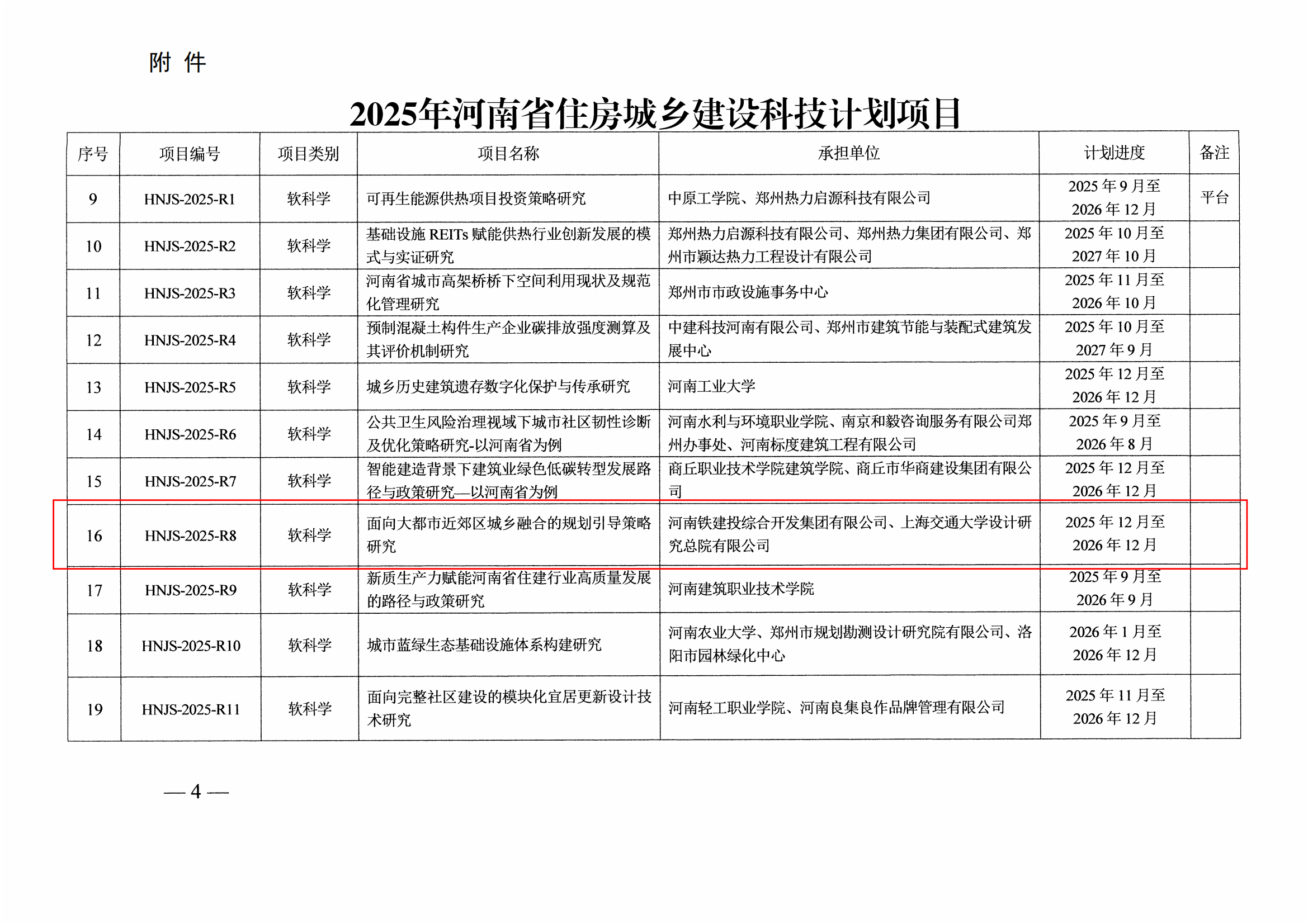 近日,河南省住房和城乡建设厅正式印发《关于2025年河南省住房城乡建设科技计划项目的通知》(豫建科〔2025〕210号),河南铁建投综合开发集团有限公司与上海交通大学设计研究总院有限公司联合开展的课题《面向大都市近郊区城乡融合的规划引导策略研究》成功纳入软科学类项目。